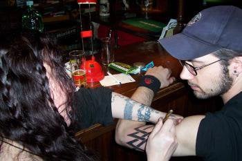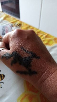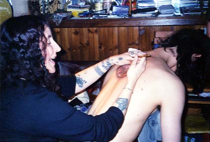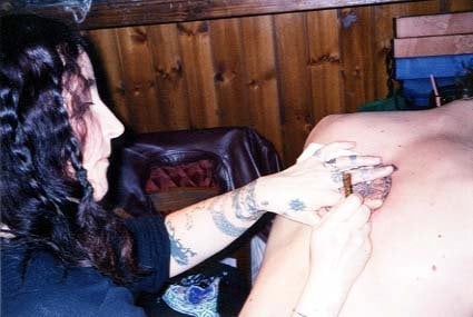Ogni tatuaggio viene disegnato a mano libera sulla pelle e viene battuto con aghi sterilivergini montati su un supporto di legno di nocciolo.